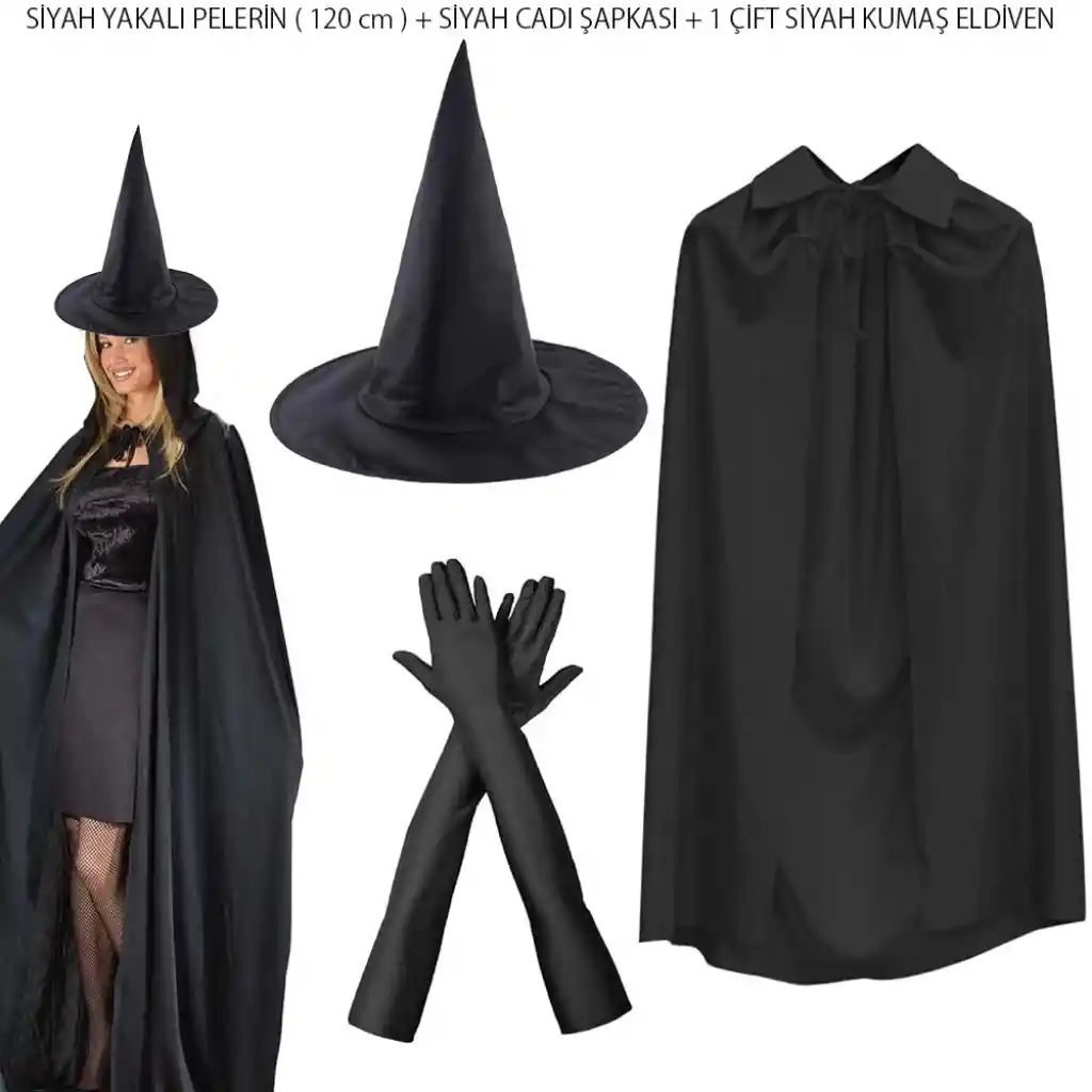 120 cm Siyah Yakalı Cadı Pelerini Cadı Şapkası ve 1 Çift Siyah Kumaş Eldiven Seti 3 Parça