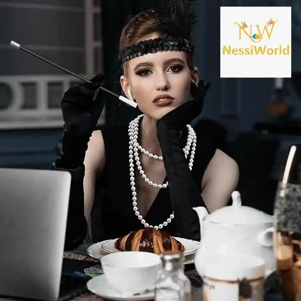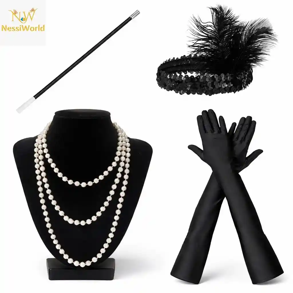1920’ler Çarliston Aksesuar Seti – İnci Kolye, Eldiven, Sigara Tutucu, Siyah Saç Bandı
