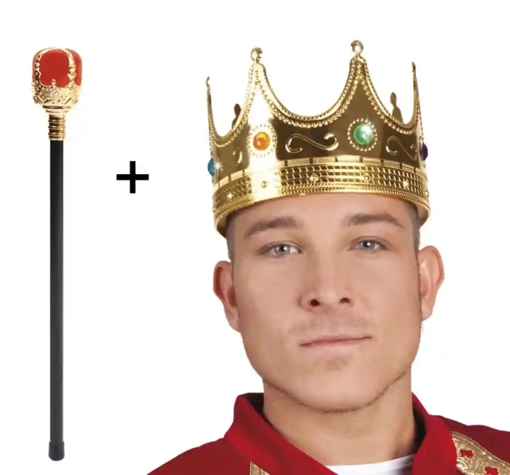 Altın Renk 60cm Kral Tacı Kraliyet Tacı ve Kırmızı Topuzlu Kral Asası Seti