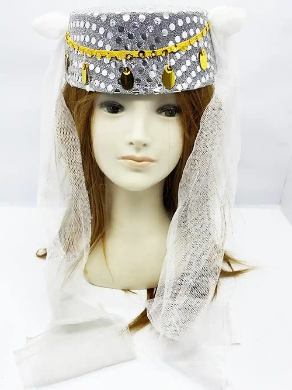 • Beyaz Duvaklı Altın Pul İşlemeli Kına Fesi Kına Şapkası Oryantal Şapkası