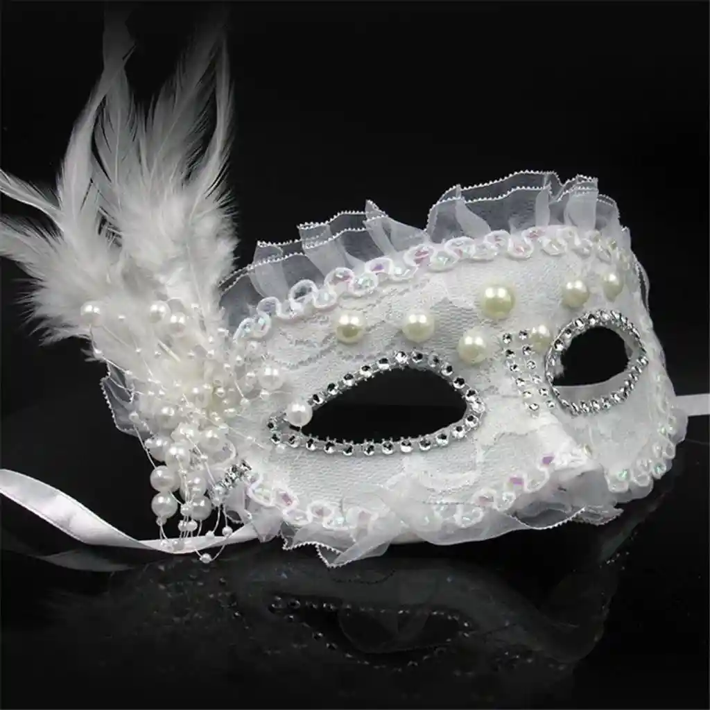 Beyaz Renk Yandan Tüylü İnci İşlemeli Taşlı Dantelli Parti Maskesi 17x12 cm