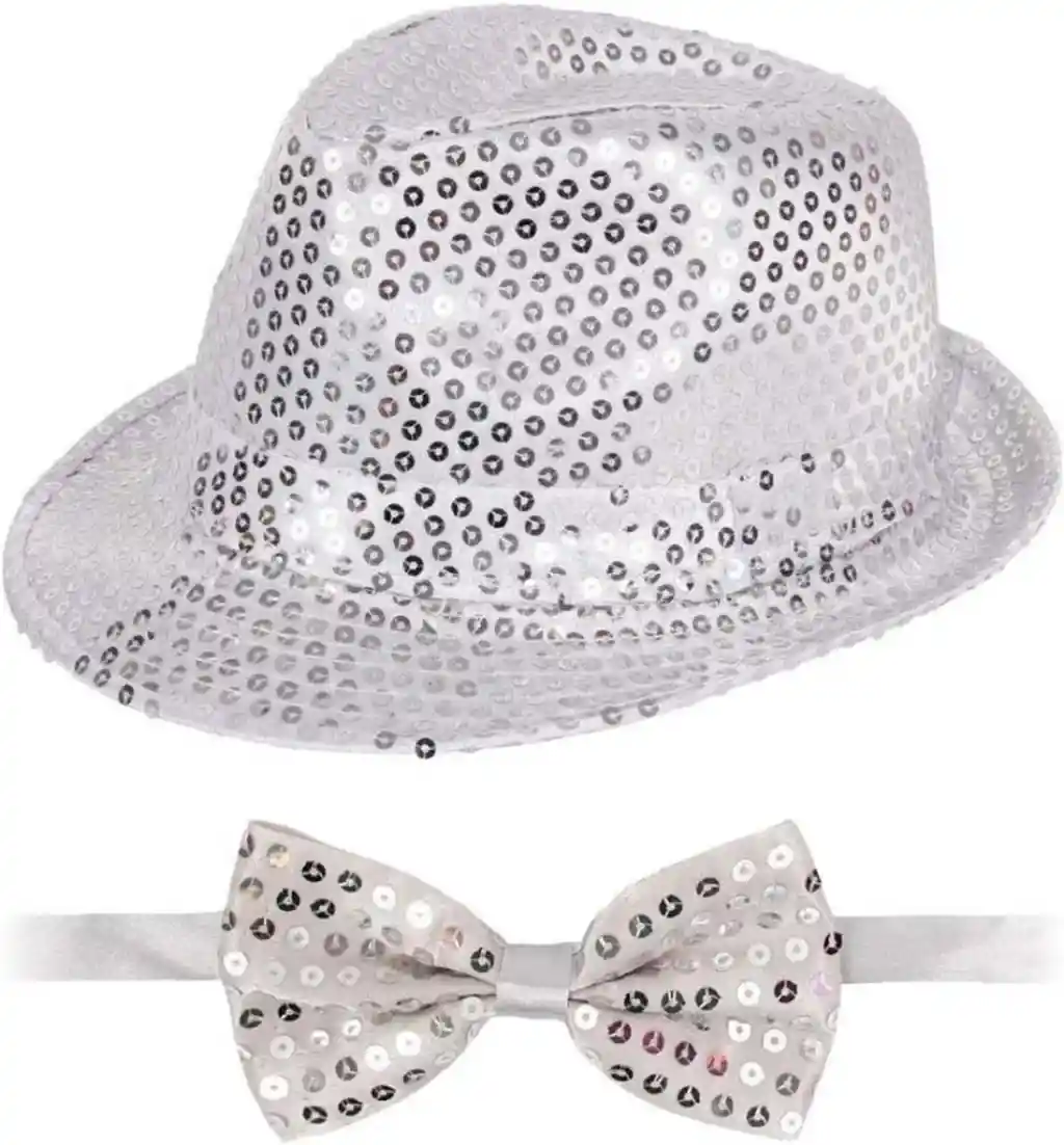 Gümüş Payetli Şapka ve Papyon Seti – Parıltılı Yetişkin Kostüm Seti