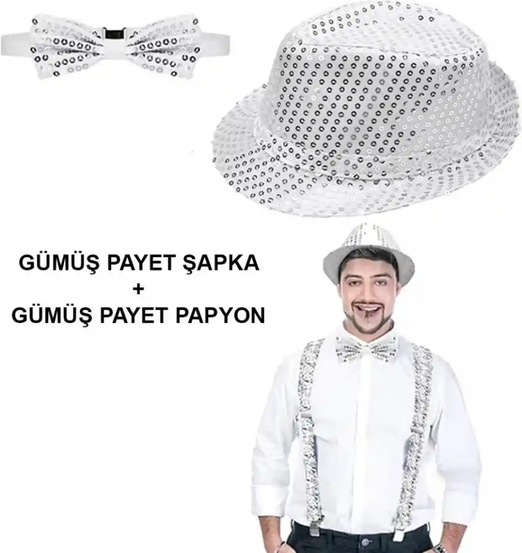 • Gümüş Payetli Şapka ve Papyon Seti – Parıltılı Yetişkin Kostüm Seti
