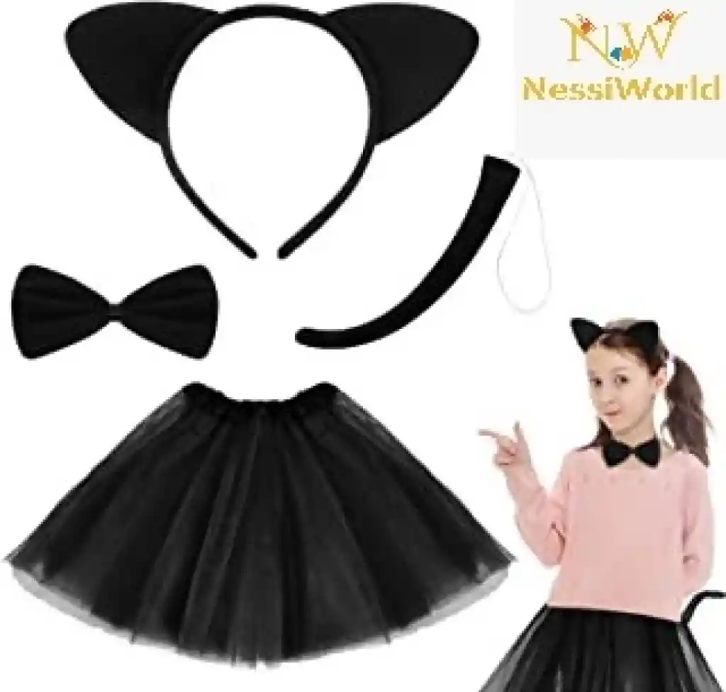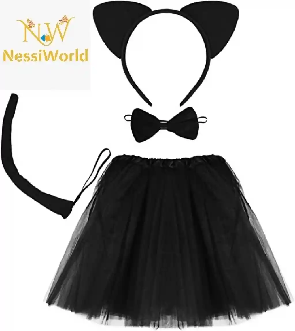 Kedi Eteği Tacı Kuyruğu ve Papyon Seti Siyah Renk Çocuk Boy