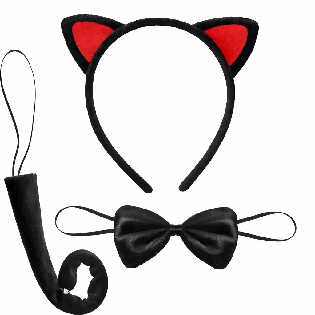 Kırmızı Kulaklı Kedi Kostüm Seti – Taç Papyon Kuyruk 3 Parça