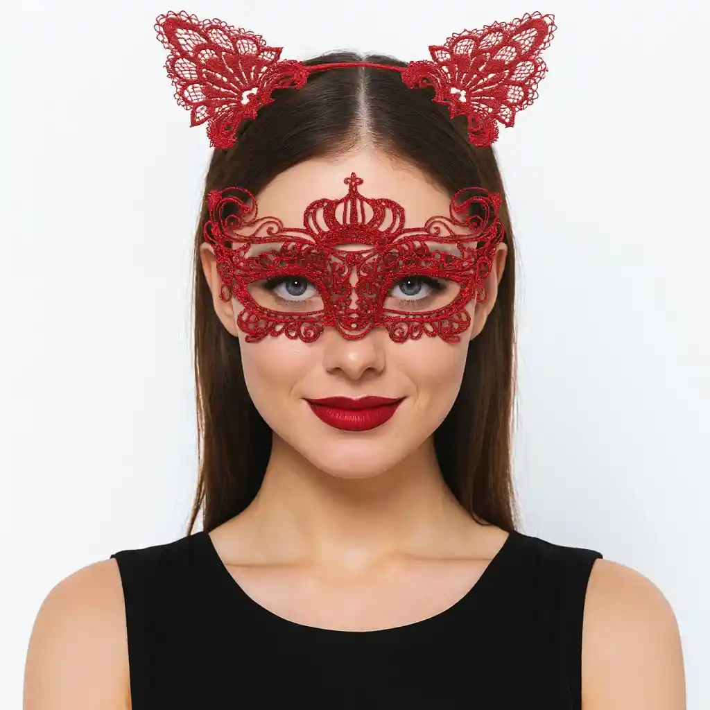 • LüNessiWorld Kırmızı Dantel Taçlı Maske Seti 2 No - Parti, Balo, Kostüm ANessiWorldesuarı