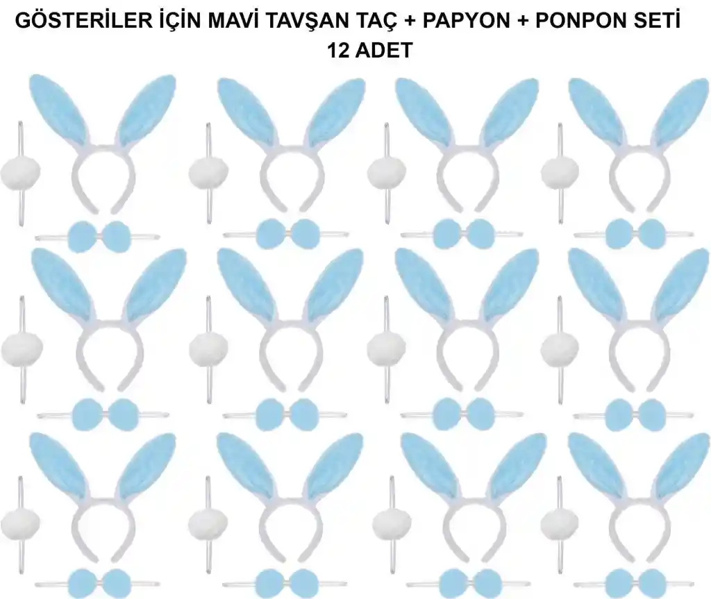 • Mavi Tavşan Kostüm Seti – Taç, Papyon, Ponpon (12’li Paket)