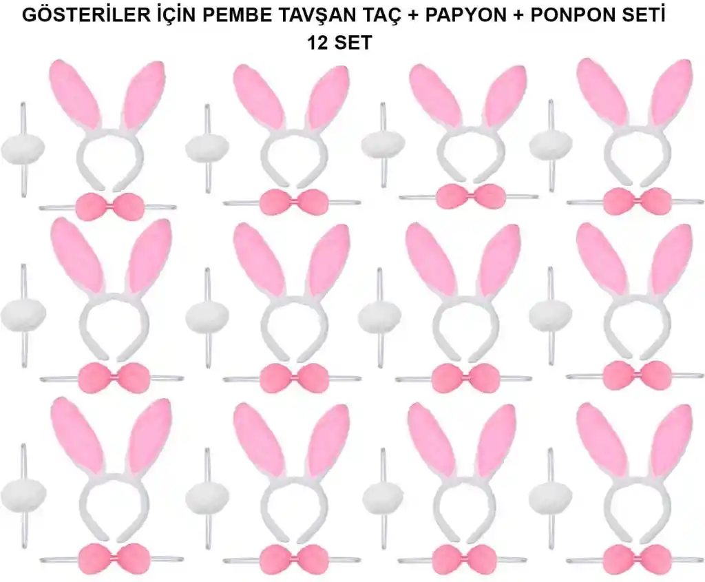• Pembe Tavşan Kostüm Seti – Taç, Papyon, Ponpon (12’li Paket)