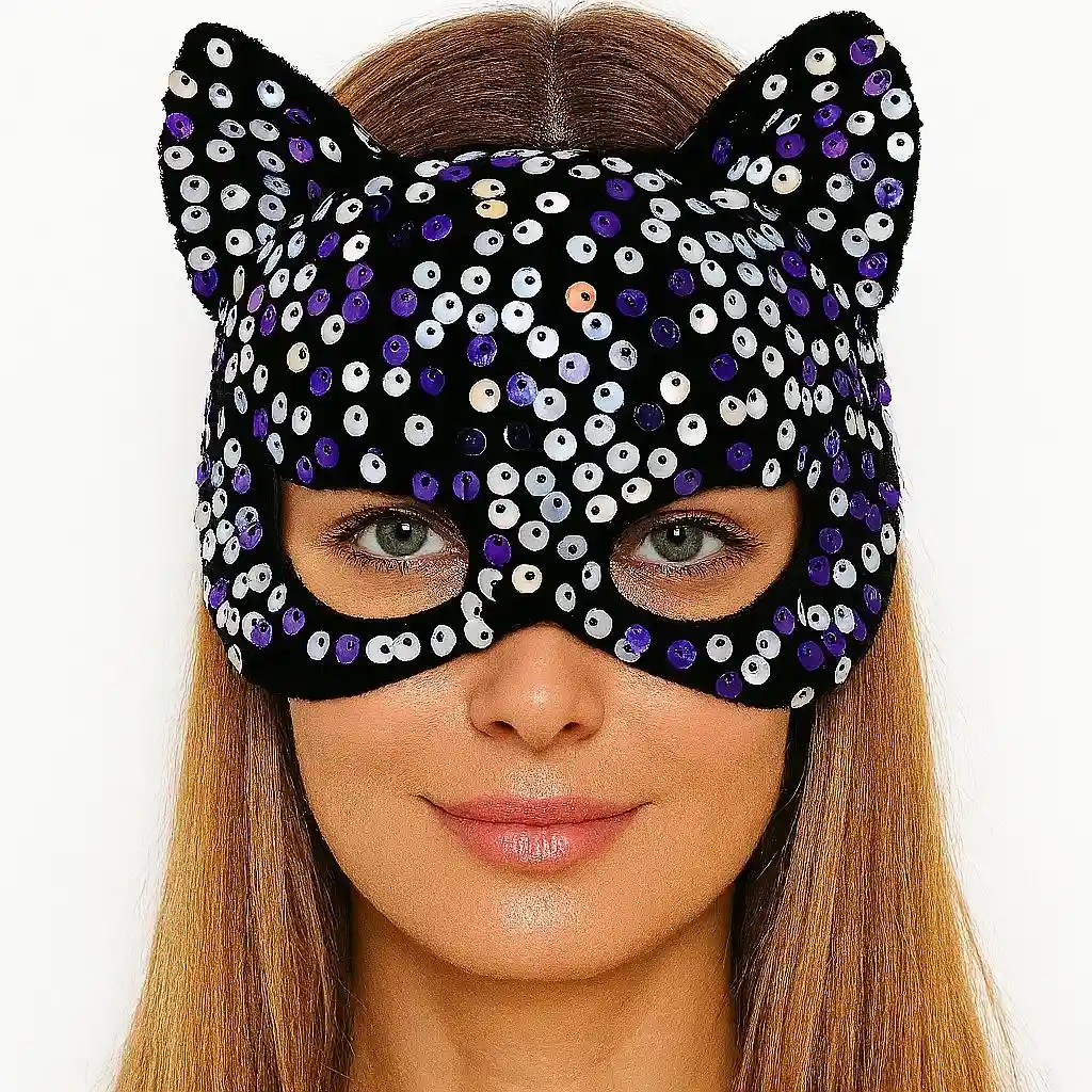 • Siyah Kadife Kumaş Üzerine Mor Beyaz Payetli Pullu Parti Maskesi 16x14 cm