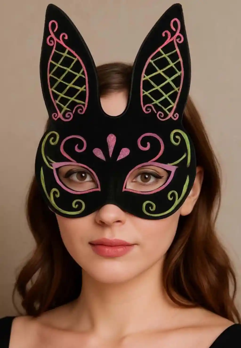 Siyah Renk Pembe Gold Simli Siyah Süet Kaplama Tavşan Maskesi 18x16 cm