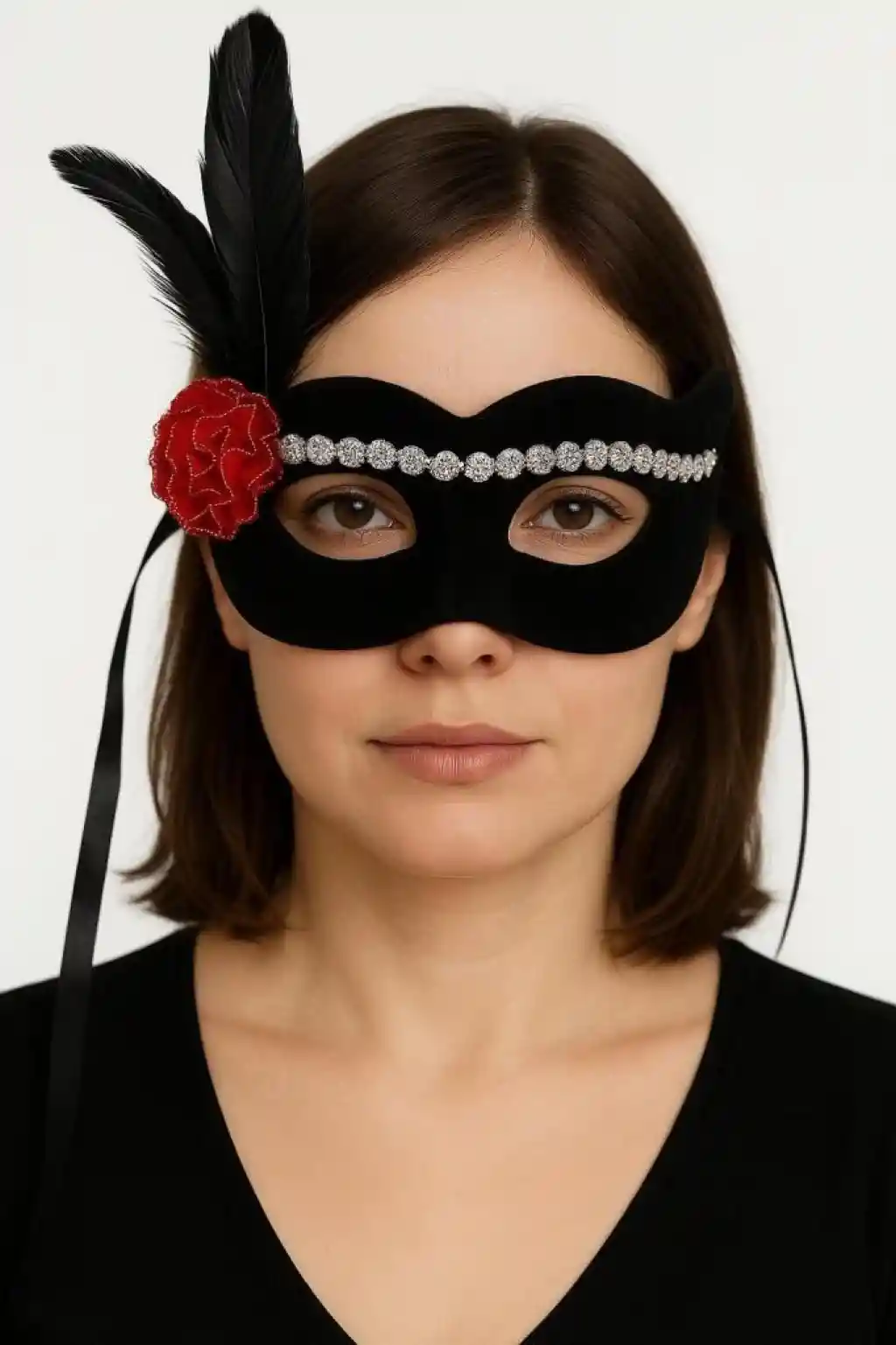 Siyah Renk Süet Kaplama Gümüş Dantelli Kırmızı Gül Tasarımlı Parti Maskesi 18x20 cm