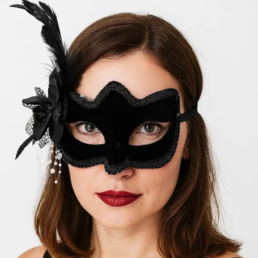 Siyah Renk Yandan Tüylü Beyaz İncili Süet Kaplama A Kalite LüNessiWorld Parti Maskesi 20x23 cm