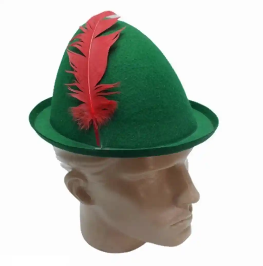 • Yeşil Renk Kırmızı Tüylü Peter Pan Şapkası Robin Hood Şapkası 24X23 cm